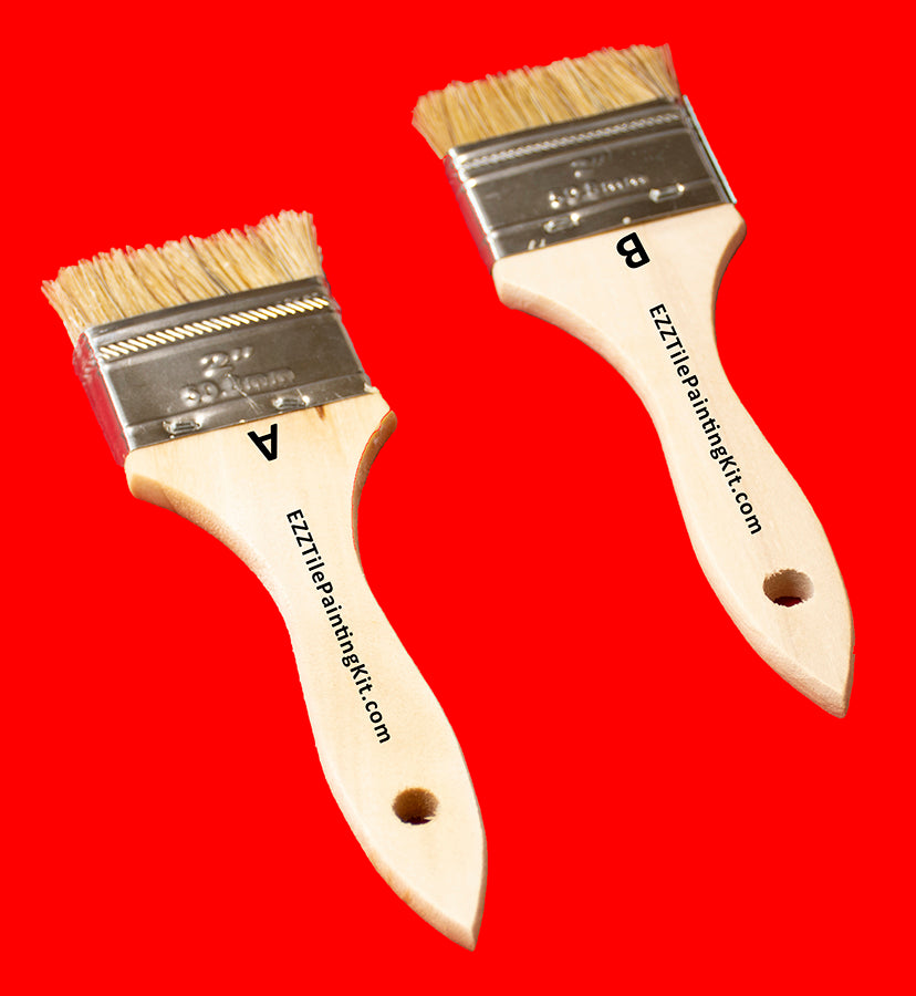 Set of two 2" EZZ Custom Cut Tile Brushes. These brushes are designed to work with the EZZ Tile Painting Holder and Tray. They are sized specifically for paint application to all 3 profiles produced by the RevealCut.com workstation for factory-profile edges: square tegular, angled tegular and bevel square tegular.